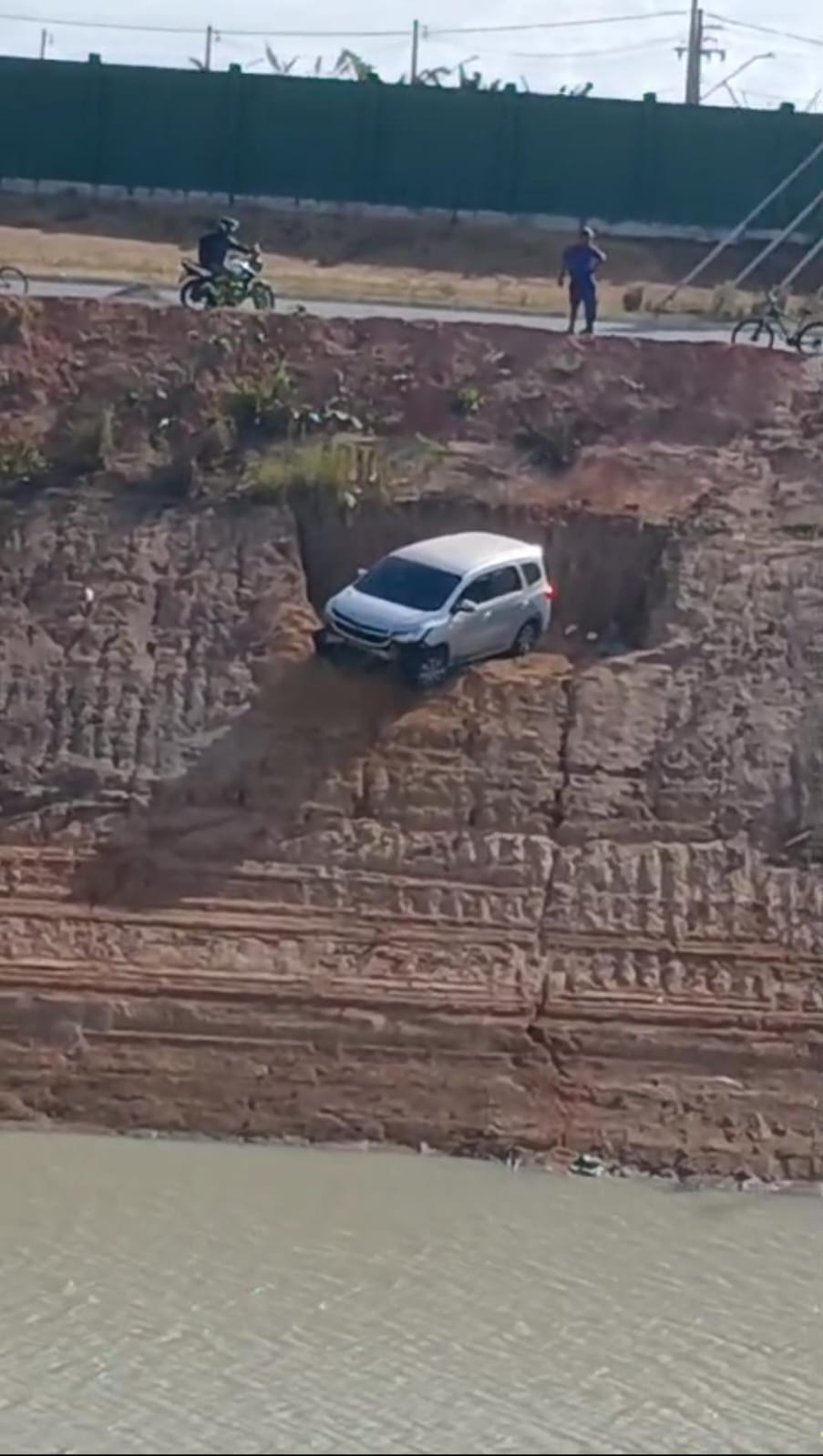 Após um acidente no trânsito, um carro caiu em uma ribanceira e quase despencou de vez em um córrego. O veículo só não caiu na água porque parou em um buraco que havia na ribanceira.